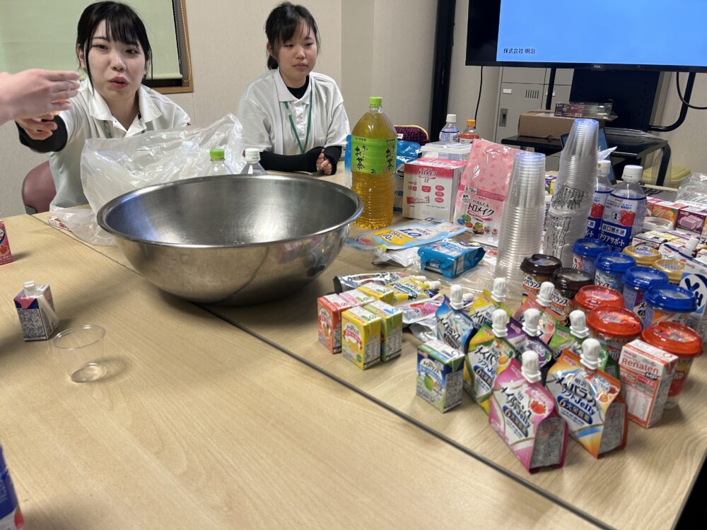 栄養食品等を取り扱っている企業様にもご協力いただきトロミ剤の濃度テストや試食・試飲を行いました!なんでもさじ加減が大事だと身をもって学びました。