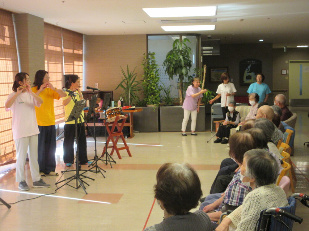 今回来て頂いたのは、「響笛(ひびき)」というボランティアグループになります。何のグループかというと篠笛の演奏を披露しているグループになります。 こんな感じで演奏会を行って頂きました。