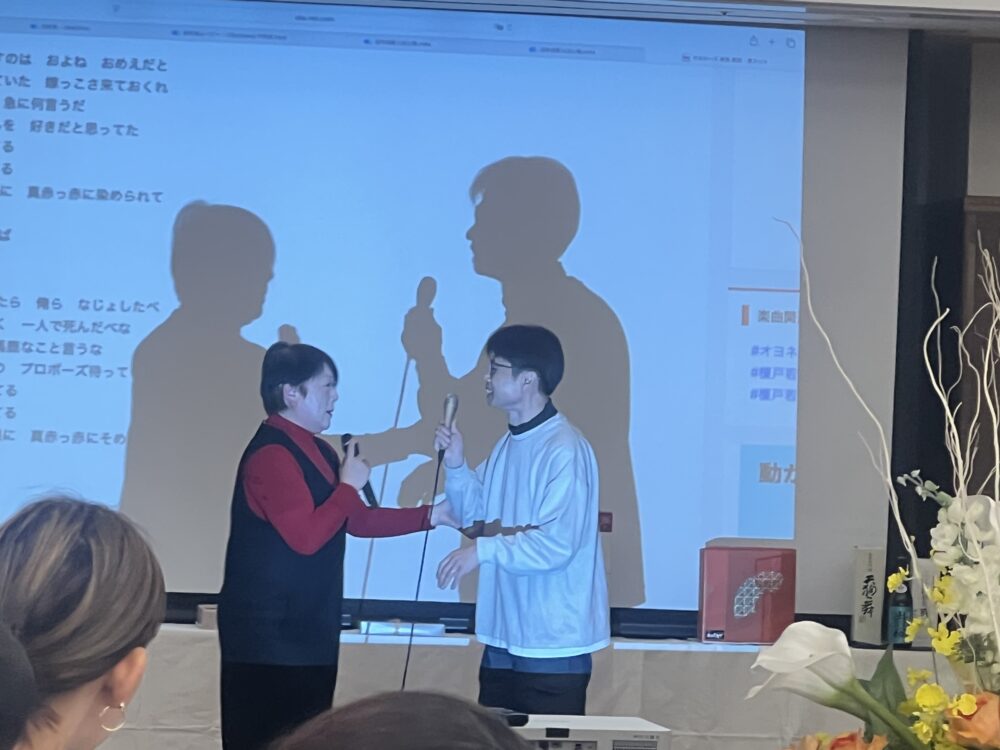 正和会名物新人職員による一芸披露(右二人は自己紹介だけなので気が楽そうです🤣)