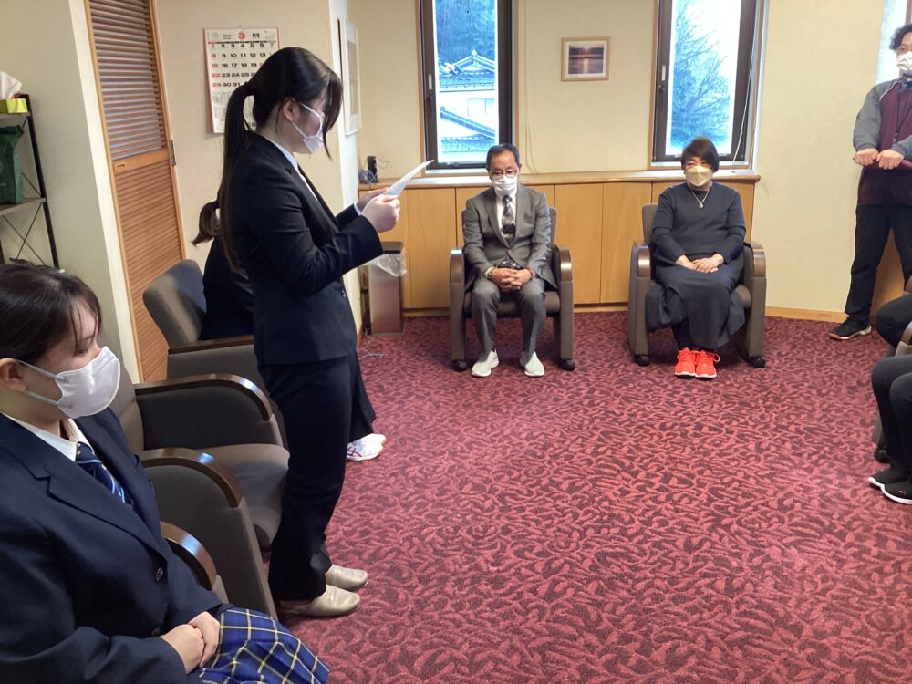 少し緊張した様子でお礼の言葉を述べる、内定者代表のSさん。